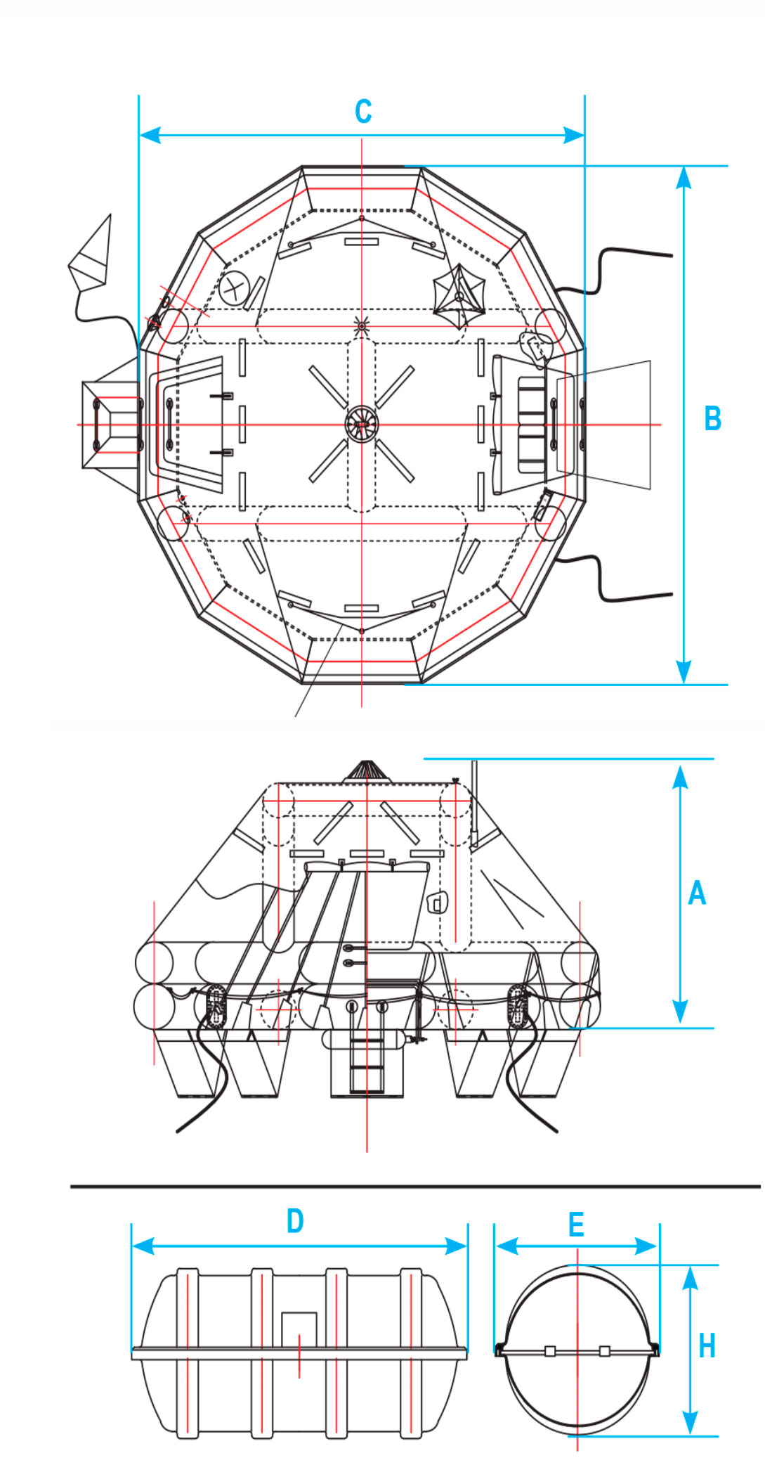 Specifikationerne nedenfor viser den samlede vægt af redningsflåden inklusive beholder, uden dæksstativ.