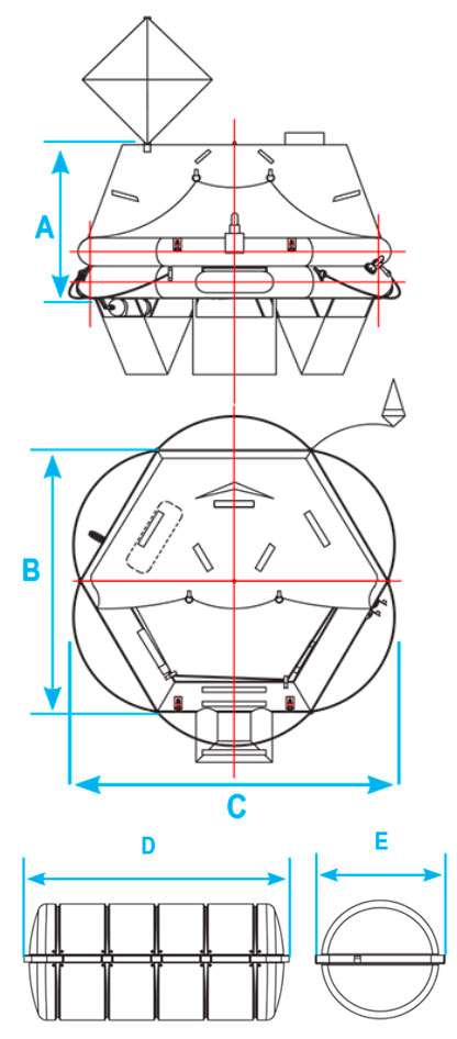 Specifikationerne nedenfor viser den samlede vægt af redningsflåden inklusive beholder, uden dæksstativ.